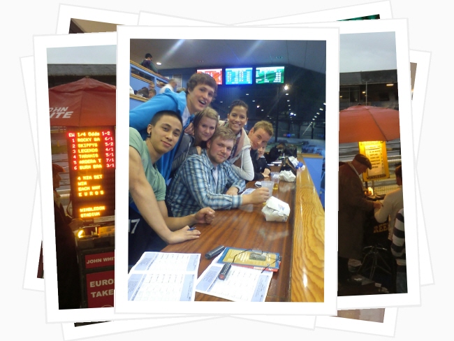 Greyhound Racing After a wet bus trip, we arrived at Wimbledon. We paid 5 Pounds for entry. In the stadium we sat down and the first dogs were introduced. And now everyone could bet. After half an hour the races began. Some guys didn’t win anything and lost a lot of money but other guys won a lot of money. After a few races some pupils of our class bought a snack and something to drink. After 15 races (3 hours) this exciting event was over. By Florian Kircher & Mario Achenbach